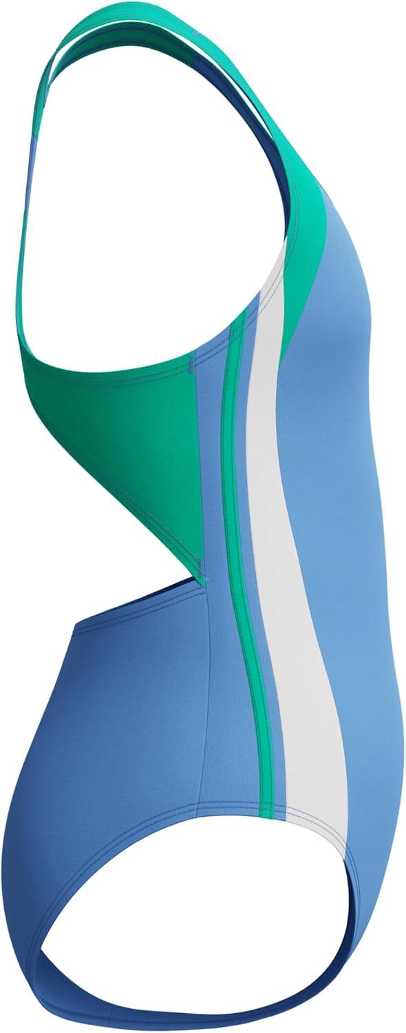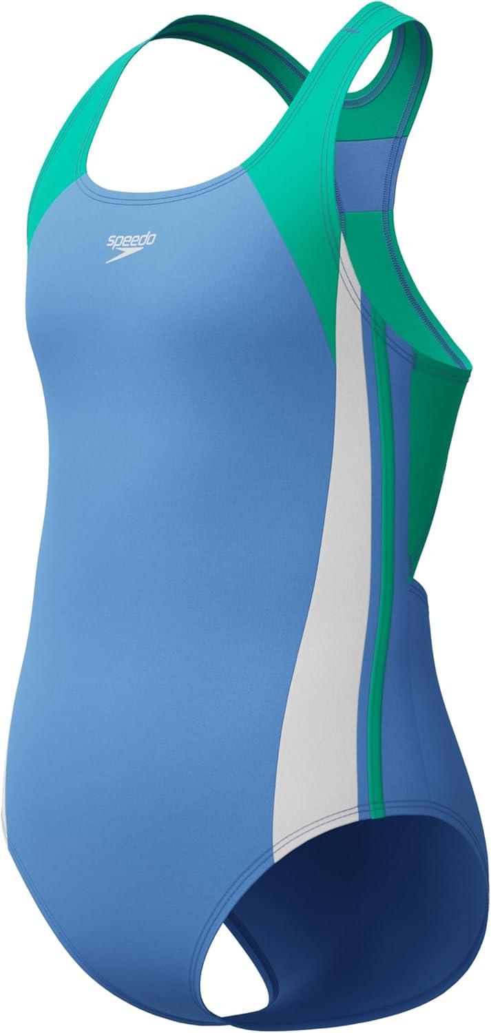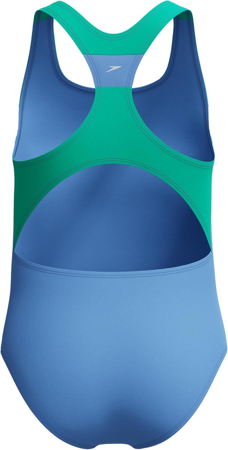 Speedo Boy's Size Charts Speedo Girl's Size Charts Swim laps around the competition in the Infinity Splice One-Piece Swimsuit. Xtra Life Lycra® Fiber: • Lightweight stretch fabric offers a wider range of motion in and out of the water.• Engineered to last over 200 hours in the pool.• Resists sagging, suntan lotion, oils, and chlorine. UV50+ Block the Burn protection from the sun's harmful UVA and UVB rays. Scoop neckline. Racerback design with cutout detail. No-Wedgie Worries offers silicone gripper at back legs for stay-put comfort. Moderate-rear coverage. 82% polyester, 18% spandex;Lining: 100% polyester. Hand wash, line dry. Imported. Measurements: One Piece Length: 19 in Product measurements were taken using size 8 Big Kids. Please note that measurements may vary by size. If you're not fully satisfied with your purchase, you are welcome to return any unworn and unwashed items with tags intact and original packaging included.