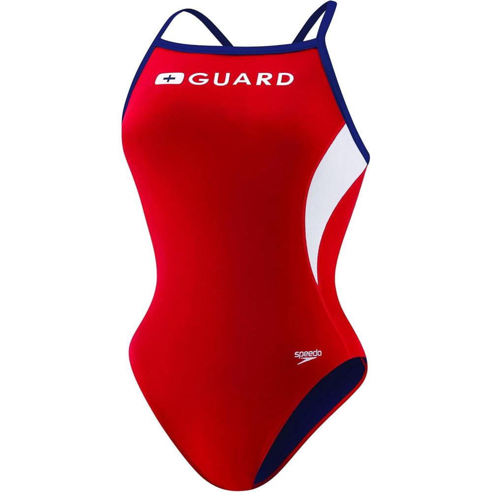 Speedo equals better fit, performance, quality, and innovation. The guard energyback is a popular thin strap silhouette with guard logo, inspired by those who save lives. The suit features our exclusive endurance plus chlorine resistant fabric, but in endurance lite, which is 10 percentage lighter weight for less drag but the same long lasting qualities. In fact, the suit lasts 20 times longer than ordinary spandex, and also has our four way stretch technology for a body hugging fit and softer feel. So no bag and sag, and it looks like new for longer. Look and feel your best in or out of the water, while you play, train or win in speedo, the choice of champions.