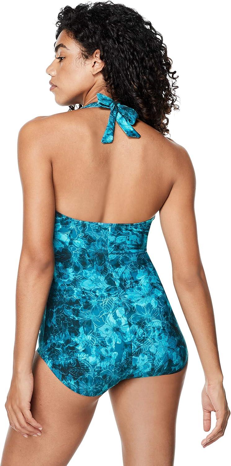 Speedo Women’s Swimsuit One Piece V-Neck Shirred Halter Moderate Cut(Turkish Sea)
